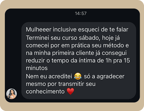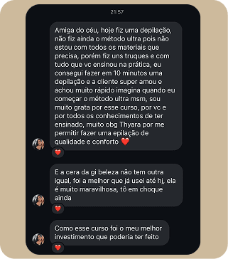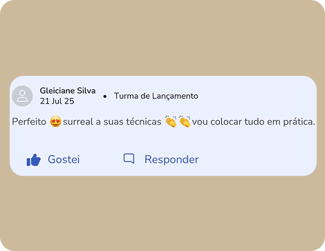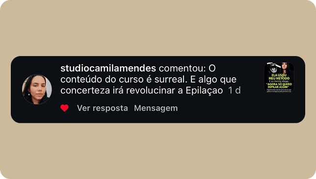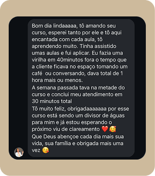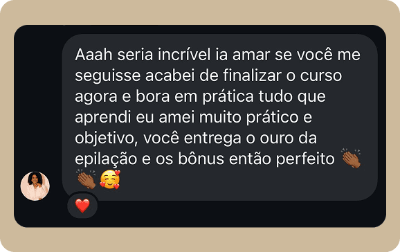 Só depois de muita entrega, resultados reais e vivência como epiladora, criei um método sólido, responsável e testado. Antes mesmo de lançar o curso completo, compartilhei apenas 3 etapas do método em palestras pelo Brasil e já transformei o atendimento de inúmeras profissionais.